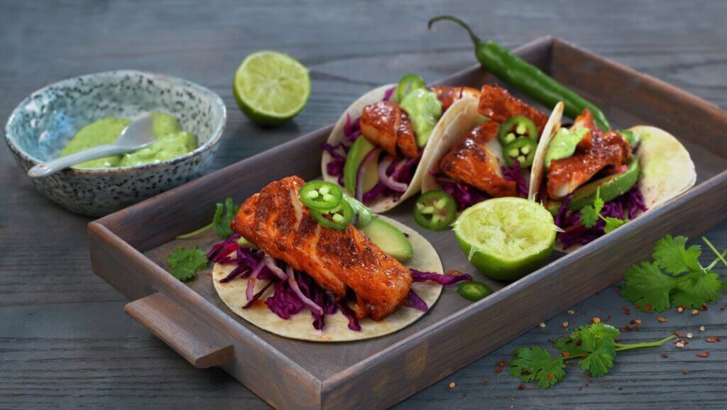 Uppskrift fyrir 4. Innihald 600 g Þorskhnakkar 2 tsk paprikuduft 0,5 tsk malað brodd kúmen 0,5 tsk salt 0,5 tsk malaður pipar 0,25 tsk cayenne pipar   Guacamole 2 stk avókadó safinn af 1/2 lime 0,5 tsk salt 2 matskeiðar saxaður ferskt kóríander   Salat 300 g rauðkál 1 stykki rauðlauk 0,5 stk sítróna 0,5 tsk salt 0,5 tsk malaður pipar   Berið fram með 8 stk stórar tortillur 1 stykki avókadó 1 stykki grænt chili 1 búnt af ferskum kóríander 1 stykki sítróna Aðferð Blandið öllu þurrkryddinu saman í skál.   Skerið fiskinn í helming, […]